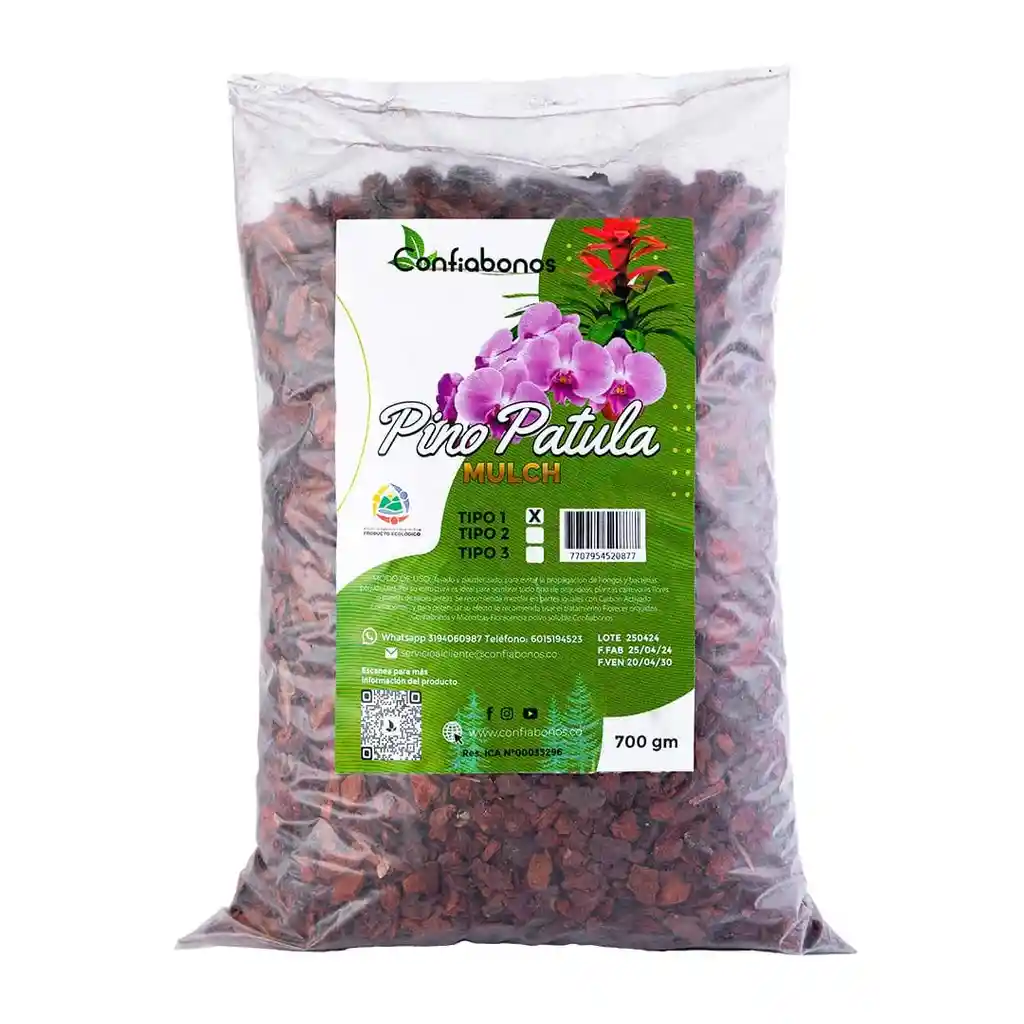 Corteza del pino patula triturada en tres tamaños diferentes, es indicado para siembra de orquídeas y bromelias, también es utilizado como aislante de altas temperaturas y para decoración de jardines.