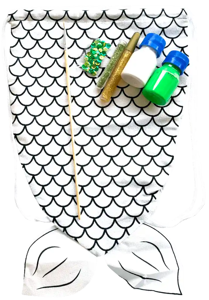 Este play kit incluye una tula de algodón con cuerdas ajustables en forma de cola de sirena, pintura, pincel, paleta para mezclar los colores, silicona, escarcha, lentejuelas, instrucciones y empaque.