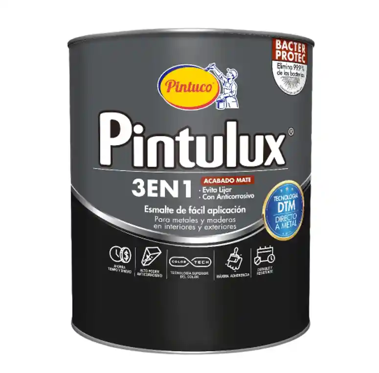 Esmalte alquídico que evita lijar en superficies con oxidación leve, contiene anticorrosivo y da un hermoso acabado brillante. Diseñado para aplicar directo al metal con una excelente adherencia, durable y resistente a la corrosión. Prepara, protege y decora en un solo paso. Producto formulado sin plomo ni cromo. USOS: Recomendado para proteger y decorar superficies y/o artículos de metal y madera en ambientes interiores y exteriores como estructuras metálicas, puertas, portones, ventanas, rejas, marcos, etc. Puede ser aplicado sobre superficies metálicas oxidadas, ya que por su diseño Pintulux 3 en 1 funciona como inhibidor de óxido que brinda una excelente protección y da un acabado brillante, simplificando el proceso de aplicación. INSTRUCCIONES DE USO: Antes de aplicar, verifique que la superficie esté seca, libre de grasa, polvo y/o pintura deteriorada. Repare los defectos que puedan afectar el acabado. No requiere base anticorrosiva. En repintes sobre pinturas en buen estado lije la superficie pintada con papel de lija Nº 220 antes de aplicar el esmalte. En metales no ferrosos como aluminio, zinc, hojalata, galvanizados y metales pulidos aplique una mano de Wash Primer Preparación del Producto y Aplicación: Mezcle el esmalte Pintulux® 3 en 1 con una espátula limpia hasta obtener su completa uniformidad. Observaciones: las fotografías de productos y ambientes son ilustrativas, algunos atributos de color y textura pueden variar de acuerdo a la resolución de tu pantalla y diferir de la realidad. Los elementos de ambientación no se incluyen en la compra.