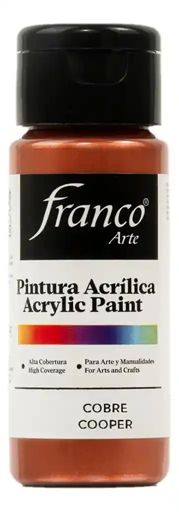 La PINTURA ACRÍLICA FRANCO ARTE es una pintura a base de agua cuyos formadores de película son emulsiones acrílicas. Esta Pintura ecora, protege o señala, materiales como: madera, MDF, yeso, cerámica, cartón, papel, icopor, paredes (interiores), entre otros. Acabado liso, durable, no se decolora, lavable, alto rendimiento, buen cubrimiento, fácil aplicación, excelente adherencia, resistencia a la abrasión, entre otros.