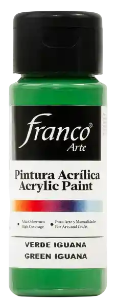 PINTURA ACRÍLICA FRANCO ARTE Descubre una pintura versátil, segura y de alto desempeño. La Pintura Acrílica Franco Arte está elaborada con emulsiones acrílicas base agua, ofreciendo una excelente adherencia, cobertura superior y un acabado profesional. Diseñada para creadores exigentes, esta pintura es ideal tanto para proyectos artísticos como decorativos. Multiusos y versátil: Se adhiere fácilmente a una amplia variedad de superficies como madera, MDF, cartón, yeso, cerámica, papel, icopor y paredes interiores. Es perfecta para manualidades, decoración del hogar, restauración de objetos, señalización, lettering, técnicas mixtas, arte country y mucho más. Su fórmula permite aplicarla con pincel, rodillo, espátula o esponja, lo que la convierte en la aliada ideal para artistas, docentes, estudiantes y amantes del DIY. Fórmula no tóxica: segura para todas las edades, sin sacrificar intensidad de color ni resistencia. Rendimiento y precisión: Cubre más con menos. Su textura permite trazos definidos, mezcla de colores uniforme y una aplicación sin complicaciones.