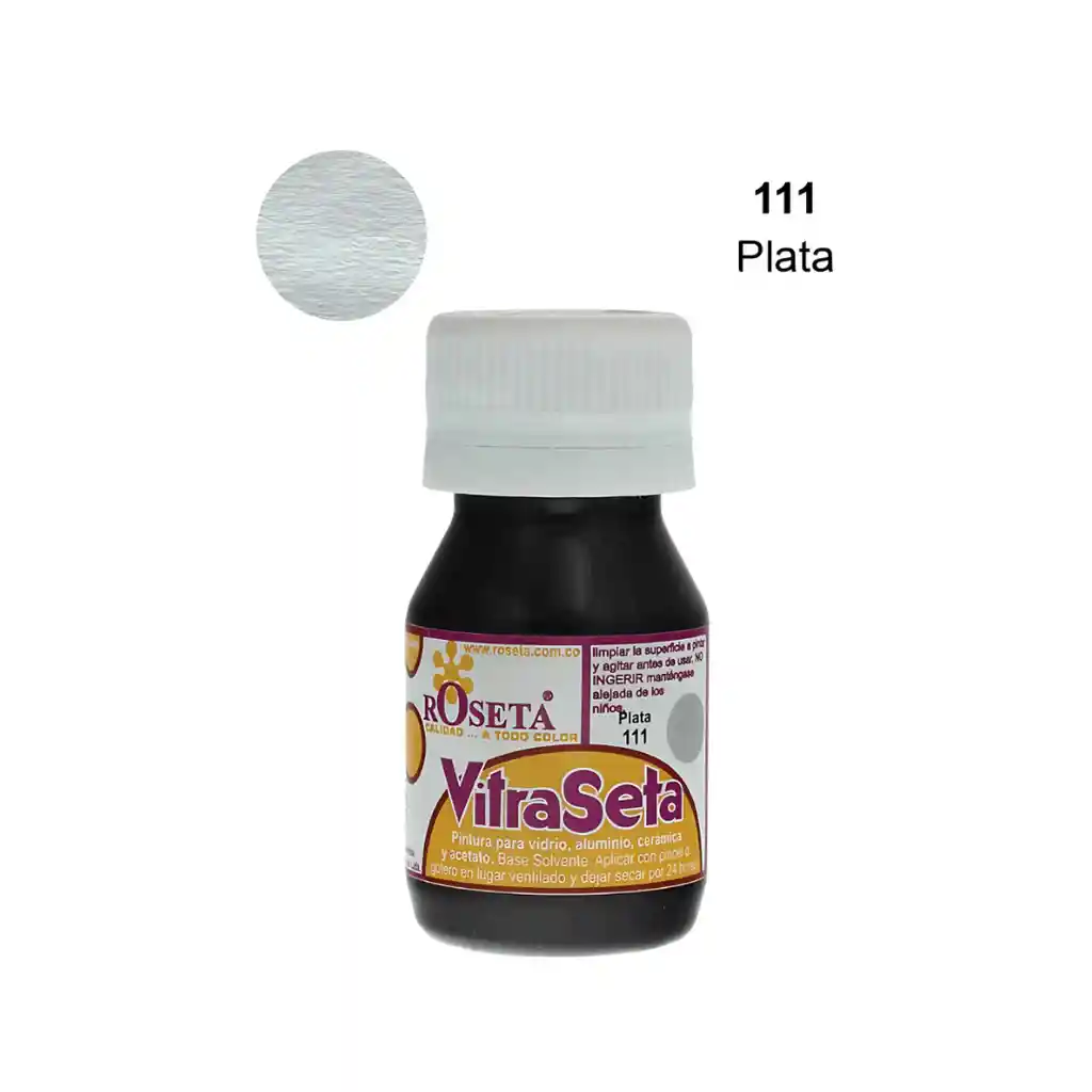 "Pintura transparente para vidrio, acetato, acrílicos, cerámica, madera y aluminio. Color 111 Plata. Antes de aplicar la superficie debe estar libre de grasa, polvo y cualquier partícula extraña. Aplique con pincel, brocha, gotero o aerógrafo. Colores mezclables entre sí para obtener más tonos. Aplicado sobre cerámica o madera da un acabado brillante."