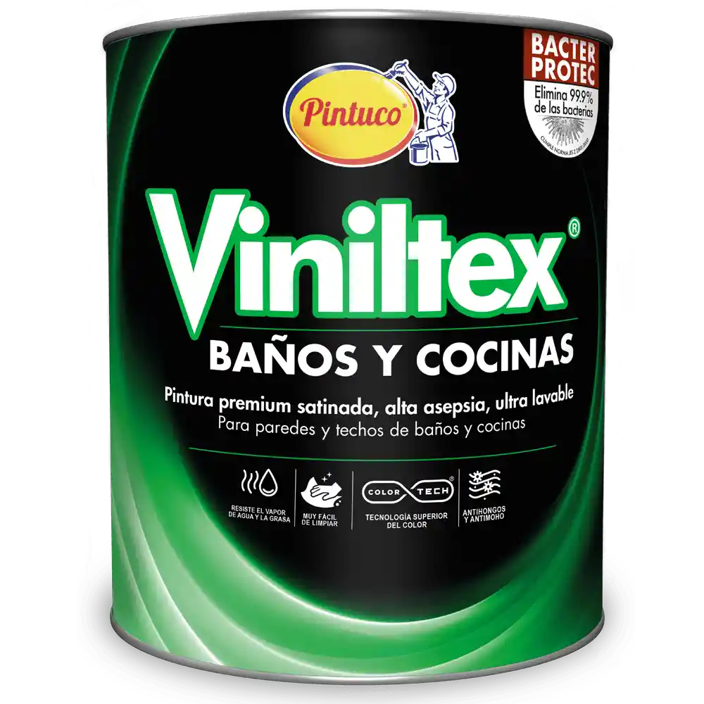 Pintura Tipo 1* de acabado satinado, diluible con agua, fabricada a partir de copolímeros acrílicos con antibacterial activo que elimina el 99,9% de las bacterias, con máxima lavabilidad y alta resistencia a la humedad, vapor, grasa, manchas, y a la formación de hongos. Producto formulado sin plomo ni cromo. *Según resolución 1154 del 22 de junio de 2016 un vinilo tipo 1 cumple: remoción de manchas (lavabilidad) ≥80%, resistencia a la abrasión ≥400 ciclos, poder cubriente ≥96%. Para este producto, según el color, las propiedades son: Remoción de manchas: 80% - 95% - Resistencia a la abrasión: 400 – 900 ciclos – Poder cubriente: ≥96% **No aplica para pinturas preparadas a partir de bases acentuadas (Accent) y tinturadas con pigmentos orgánicos de bajo poder cubriente. USOS Recomendada para proteger y decorar las paredes y techos de cocinas y baños, incluyendo el área de la ducha.
