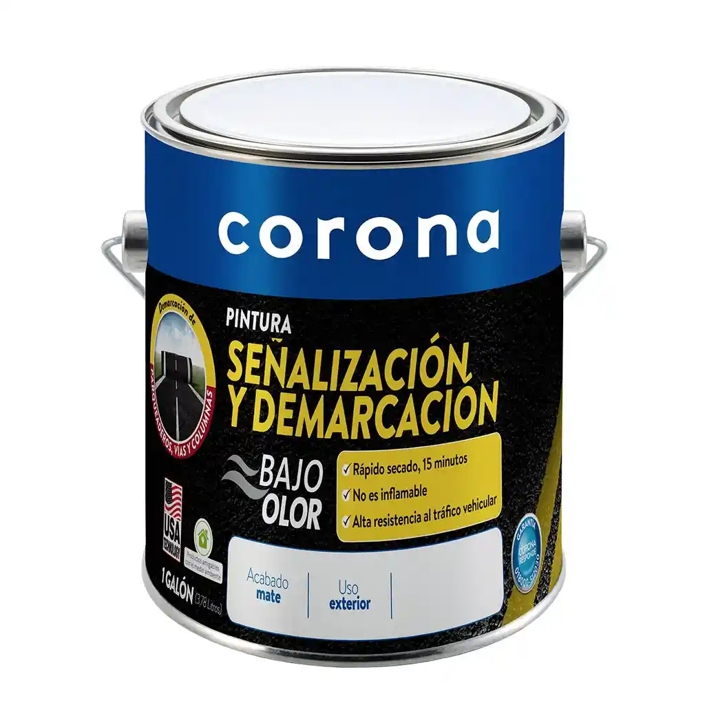 Nuestra pintura es 100 % acrílica base agua, de secado rápido, resistente a la intemperie y de alta visibilidad. ¡Perfecto para tu proyecto! Ventajas Excelente resistencia mecánica, química y a la intemperie. Bajo olor (bajo VOC). Seca rápidamente. Excelente adherencia y flexibilidad. No es inflamable. Excelente resistencia a la abrasión. Alta resistencia a la alcalinidad, hongos y rayos UV. Alto cubrimiento. Fácil aplicación con brocha, rodillo o pistola. Fácil de limpiar con agua y jabón. Tiene el respaldo y la garantía de marca Corona®.