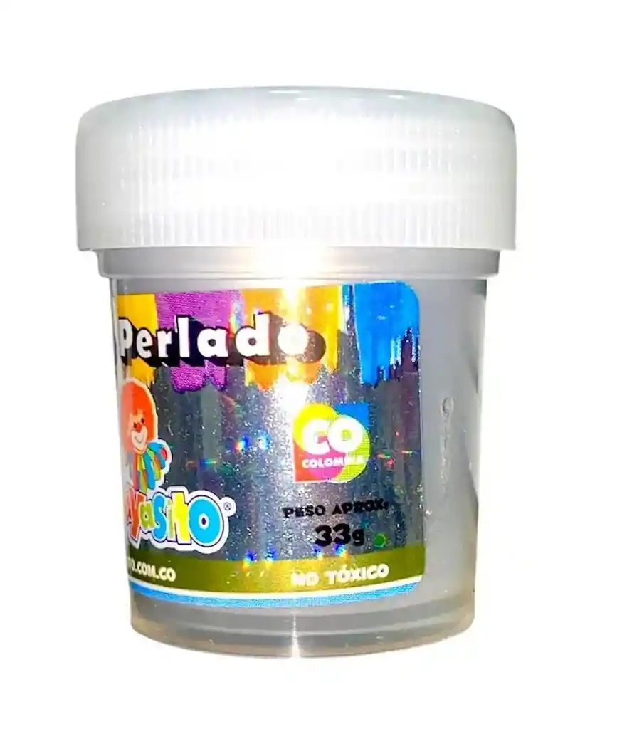 Pintura Vinilo Perlado Plateado 33 Gramos marca Payasito. Pintura a base de agua. No toxica. Para aplicar sobre ceramica, papael, madera, entre otros