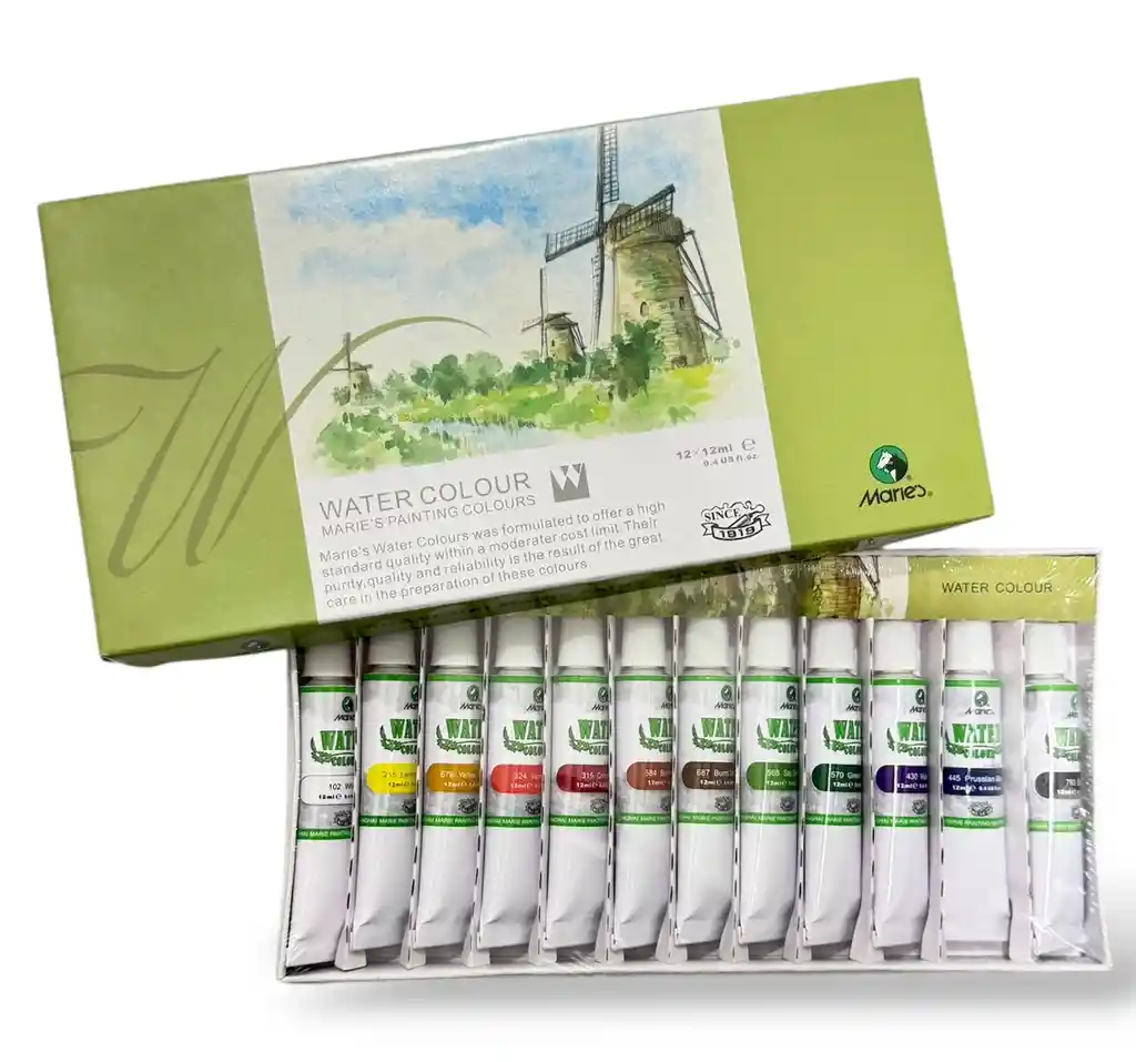 El set de Acuarela Maries incluye 12 tubos de colores vivos y transparentes, ideales para estudiantes, artistas y amantes de la pintura. Su fórmula de fácil disolución en agua permite lograr efectos suaves, mezclas armónicas y capas delicadas sobre papel y cartulina especial para acuarela. Gracias a su excelente pigmentación, estas acuarelas ofrecen un resultado brillante y duradero. Su presentación en tubo permite un uso más controlado y limpio, ideal para técnicas detalladas y trabajos artísticos de precisión. Características principales: Incluye 12 colores surtidos Acuarelas en tubo de alta calidad Colores intensos, transparentes y de fácil mezcla Secado rápido y acabado uniforme Ideal para estudiantes, artistas y manualidades Con Maries, descubre el arte de la acuarela con color, fluidez y expresión.