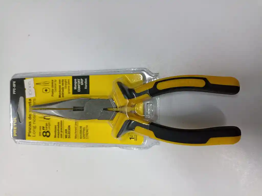 Fabricadas en acero al carbono con acabado pulido. Mayor palanca que proporciona mejor agarre y fuerza de corte. Cortes más precisos. Mango de vinil de alto desempeño, en color negro con amarillo. Punta cónica y mordaza con estriado recto para agarre firme y seguro.