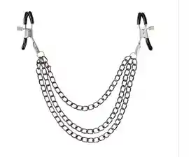 Descripción del Producto Pinzas para los pezones con alto nivel de presión. El tornillo delantero puede girarse para aumentar la presión. Tiene una extensión de cadenas que las une formando un pequeño collar. Características: Material: Metal Color: Negro, plateado