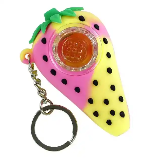 Pipa de silicona en forma de fresa con boquilla en vidrio Escoge el color que mas te guste y dale un toque creativo a tus sesiones :) Tamaño: - Largo : 7 cms - Ancho : 4,5 cms - Diámetro de la boquilla: 2,7 cms