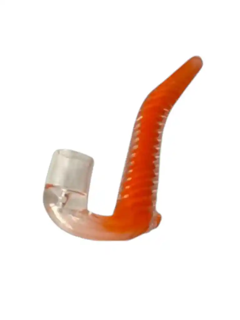 Este bong es un accesorio de vidrio artístico soplado, con diseño curvo estilo “cuello de cisne” y base redonda tipo esfera. Tiene detalles en tonos rojos y dorados que le dan un acabado elegante y llamativo. 🔥