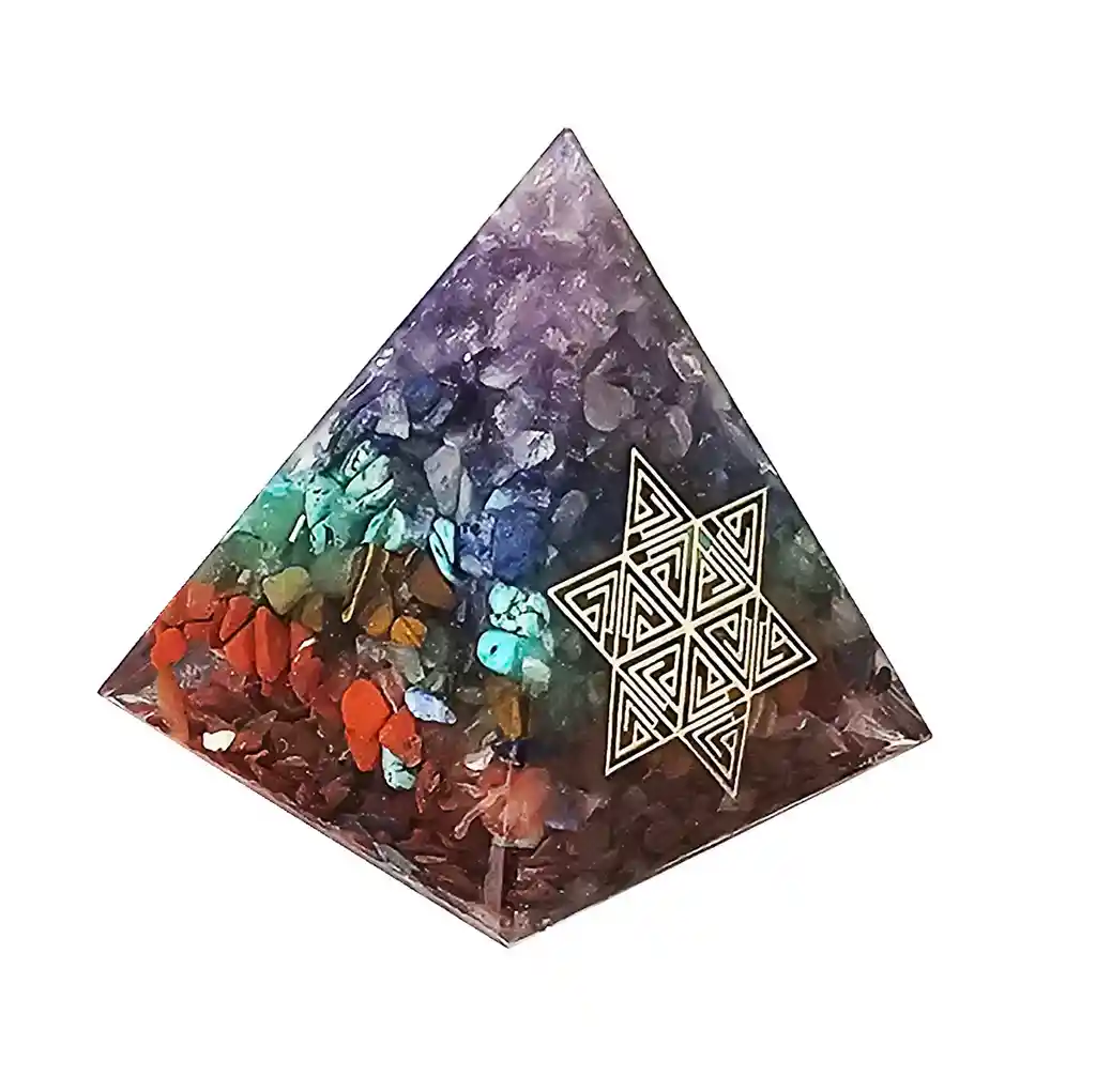 La pirámide a través de su forma geométrica mística sirve de captador de energía universal, siendo esta energía dirigida hacia nosotros por medio de su vértice. Este bella pirámide contiene las piedras de los 7 chakras de las cuales podemos mencionar amatista, citrino, turquesa, que de acuerdo a su ubicación representa la energía en diferentes partes del espacio, representando la unión entre la conciencia o la mente y la materia o el cuerpo. De esta manera nuestro ser físico, emocional, espiritual y social se unen. //Nota: Los colores de la pirámide pueden variar en su orden , estos se pueden intercalar.// Ficha Técnica: Dimensiones Base : 4,8 cm x 4,8 cm Altura: 5 cm Material: Piedra Natural - Resina - Alambre Cobre Términos de Garantía: Para defectos de fábrica o retractos: Por favor revise el producto apenas lo reciba y antes de usarlo. No aplican ley de retracto o defectos de fábrica luego de usar el producto. Se manejan máximo 5 días para reportar defectos de fábrica (por ejemplo, producto funciona mal, piezas faltantes, rotas, etc). Para hacer efectiva la devolución el producto debe devolverse con el empaque original, el cual debe estar en buen estado, incluir todos los documentos y las partes completas y sin daños. Los cuidados y recomendaciones para mantener un producto en buen estado son los siguientes: No aplicarle perfumes ni cremas directamente, no mojarlos, no dejarlos caer y procurar limpiarlos para retirar suciedad.