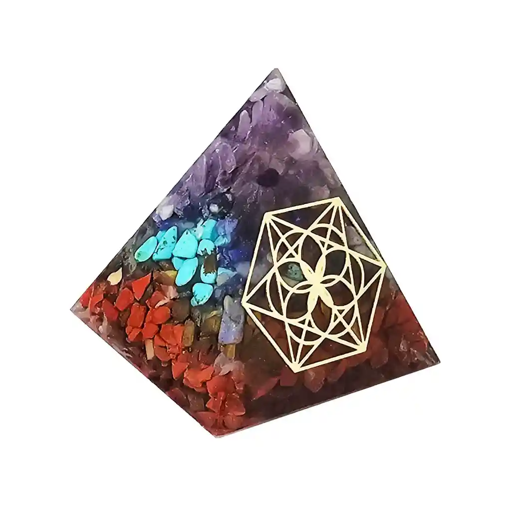 La pirámide a través de su forma geométrica mística sirve de captador de energía universal, siendo esta energía dirigida hacia nosotros por medio de su vértice. Este bella pirámide contiene las piedras de los 7 chakras de las cuales podemos mencionar amatista, citrino, turquesa, que de acuerdo a su ubicación representa la energía en diferentes partes del espacio, representando la unión entre la conciencia o la mente y la materia o el cuerpo. De esta manera nuestro ser físico, emocional, espiritual y social se unen. //Nota: Los colores de la pirámide pueden variar en su orden , estos se pueden intercalar.// Ficha Técnica: Dimensiones Base : 4,8 cm x 4,8 cm Altura: 5 cm Material: Piedra Natural - Resina - Alambre Cobre Términos de Garantía: Para defectos de fábrica o retractos: Por favor revise el producto apenas lo reciba y antes de usarlo. No aplican ley de retracto o defectos de fábrica luego de usar el producto. Se manejan máximo 5 días para reportar defectos de fábrica (por ejemplo, producto funciona mal, piezas faltantes, rotas, etc). Para hacer efectiva la devolución el producto debe devolverse con el empaque original, el cual debe estar en buen estado, incluir todos los documentos y las partes completas y sin daños. Los cuidados y recomendaciones para mantener un producto en buen estado son los siguientes: No aplicarle perfumes ni cremas directamente, no mojarlos, no dejarlos caer y procurar limpiarlos para retirar suciedad.