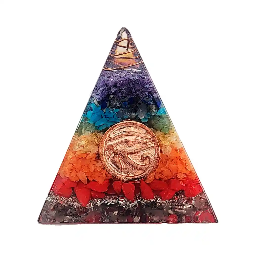 La pirámide a través de su forma geométrica mística sirve de captador de energía universal, siendo esta energía dirigida hacia nosotros por medio de su vértice. Este bella pirámide contiene las piedras de los 7 chakras de las cuales podemos mencionar amatista, citrino, turquesa, que de acuerdo a su ubicación representa la energía en diferentes partes del espacio, representando la unión entre la conciencia o la mente y la materia o el cuerpo. De esta manera nuestro ser físico, emocional, espiritual y social se unen. //Nota: Los colores de la pirámide pueden variar en su orden , estos se pueden intercalar.// Ficha Técnica: Dimensiones Base : 6 cm x 6 cm Altura: 6.5 cm Material: Piedra Natural - Resina - Alambre Cobre Términos de Garantía: Para defectos de fábrica o retractos: Por favor revise el producto apenas lo reciba y antes de usarlo. No aplican ley de retracto o defectos de fábrica luego de usar el producto. Se manejan máximo 5 días para reportar defectos de fábrica (por ejemplo, producto funciona mal, piezas faltantes, rotas, etc). Para hacer efectiva la devolución el producto debe devolverse con el empaque original, el cual debe estar en buen estado, incluir todos los documentos y las partes completas y sin daños. Los cuidados y recomendaciones para mantener un producto en buen estado son los siguientes: No aplicarle perfumes ni cremas directamente, no mojarlos, no dejarlos caer y procurar limpiarlos para retirar suciedad.