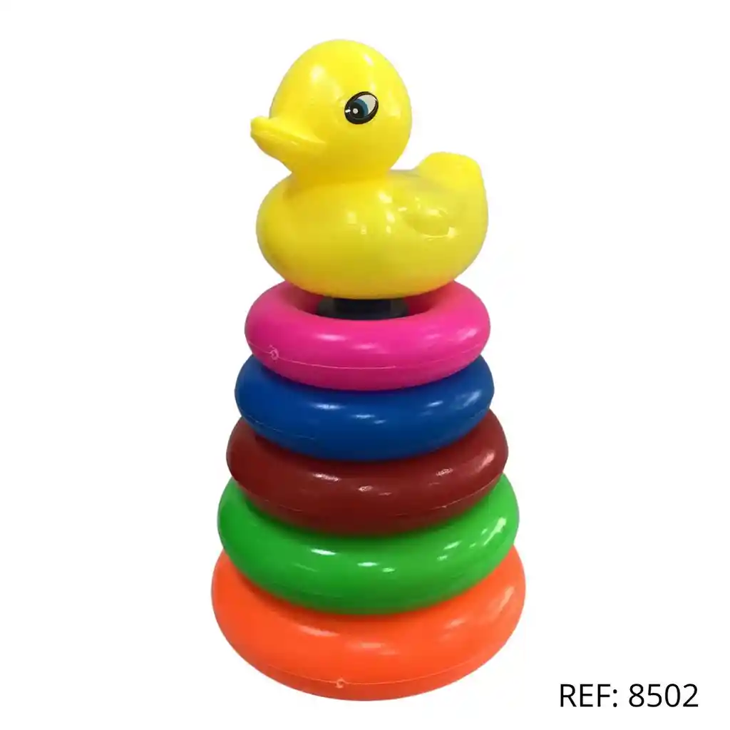 Juguete apilable con anillos de colores y pato, ideal para estimular la coordinación y el aprendizaje temprano.