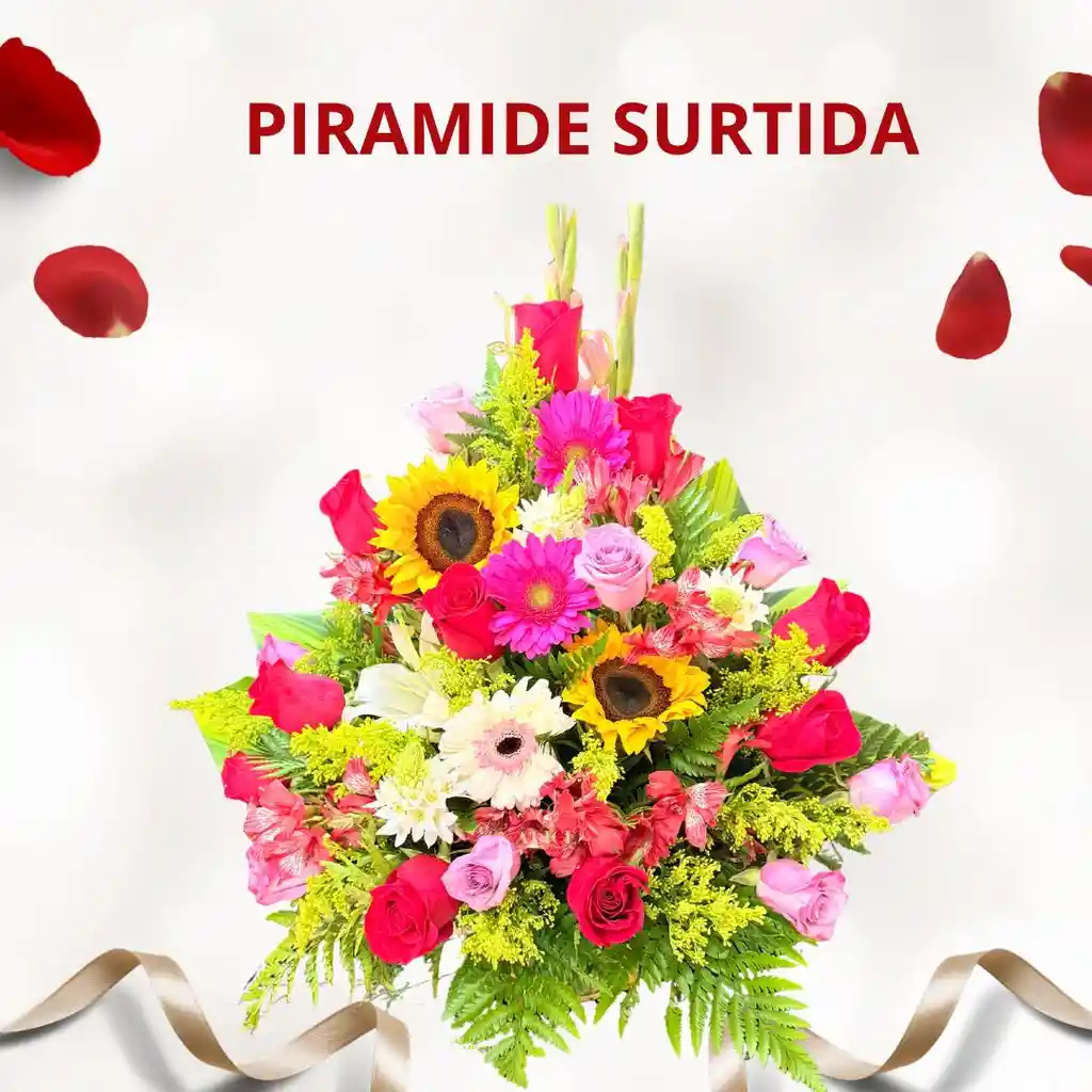 ARREGLO FLORAL EN FORMA DE PIRAMIDE CON FLORES SURTIDAS EN DISTINTOS TIPOS Y COLORES