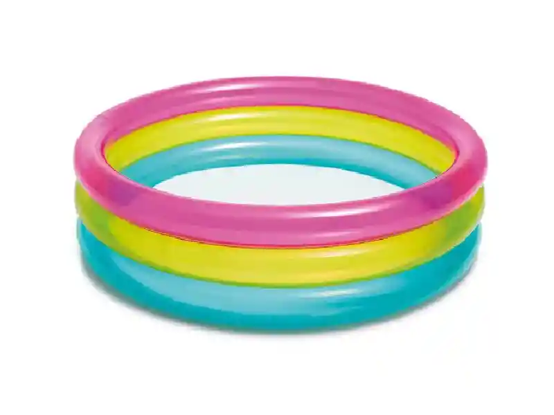 La piscina infantil Arco Iris tiene un diseño tricolor, con 3 aros transparentes en rosa, amarillo y azul, para que tu bebé disfrute de un baño exclusivo y refrescante con total seguridad mientras jugando en el agua. Recomendado para niños de 1 a 3 años pero siempre bajo la supervisión de un adulto. Medidas: 86 x 25cm Capacidad 63 litros, se recomienda llenar hasta 15cm de altura. Forma: redonda con 3 anillas. Viene con pegatina de reparación. Material de vinilo duradero.