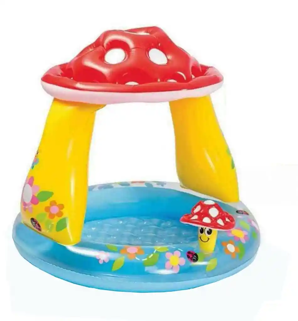 PISCINA INFLABLE GRANDE DE HONGO Para divertirse sin parar CARACTERÍSTICAS 1. Piscina hinchable para bebés Hongo. 2. El hongo actúa como parasol. 3. La base es acolchada. 4. Capacidad para 45 litros/agua. 5. incluye Kit de parches de reparación. 6. Incluye inflador MEDIDAS Medidas 102 x 89 cms. SU COMPRA QUE INCLUYE 1. Una piscina inflable de Hongo Intex