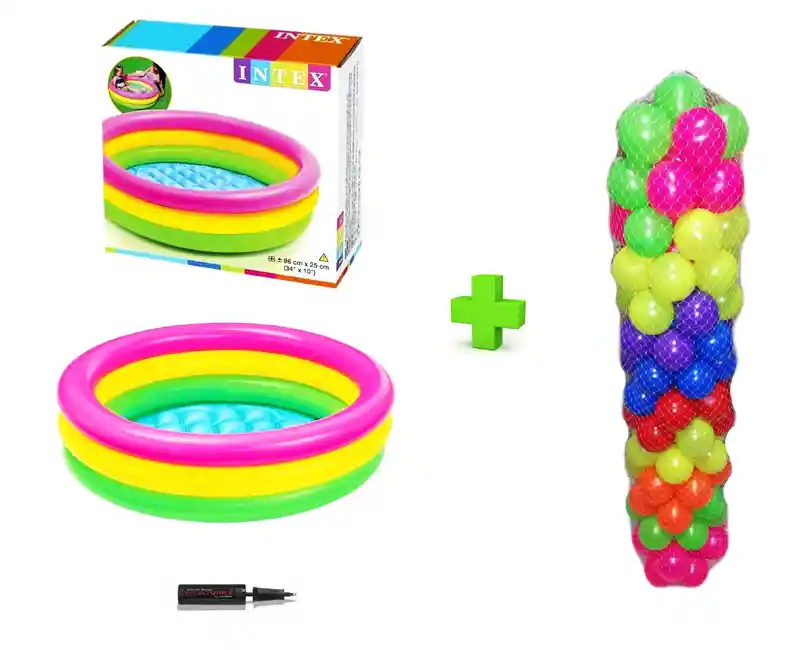 Piscina Marca Intex 86 Cms x 25 cms + 100 Pelotas + infladorPISCINA DE TRES ANILLOS INFLABLE MARCA INTEX 86 CMS CARACTERÍSTICAS1. Medidas: 86 cms x 25 cms 2. Material: vinilo 3. Diseño que incluye 3 cámaras de aire grandes con válvula antirretorno.4. Trae parche para reparación5. Inflador manual intex6. Fondo acolchado7. Se puede llenar de pelotas o aguaSu Compra Incluye:- 100 pelotas de colores de 8 cms- Piscina Intex de 86 cms presentación en caja- Inflador intex en bolsaEDAD IDEAL DE 6 MESES A 6 AÑOSSOMOS DISTRIBUIDORES DIRECTOS