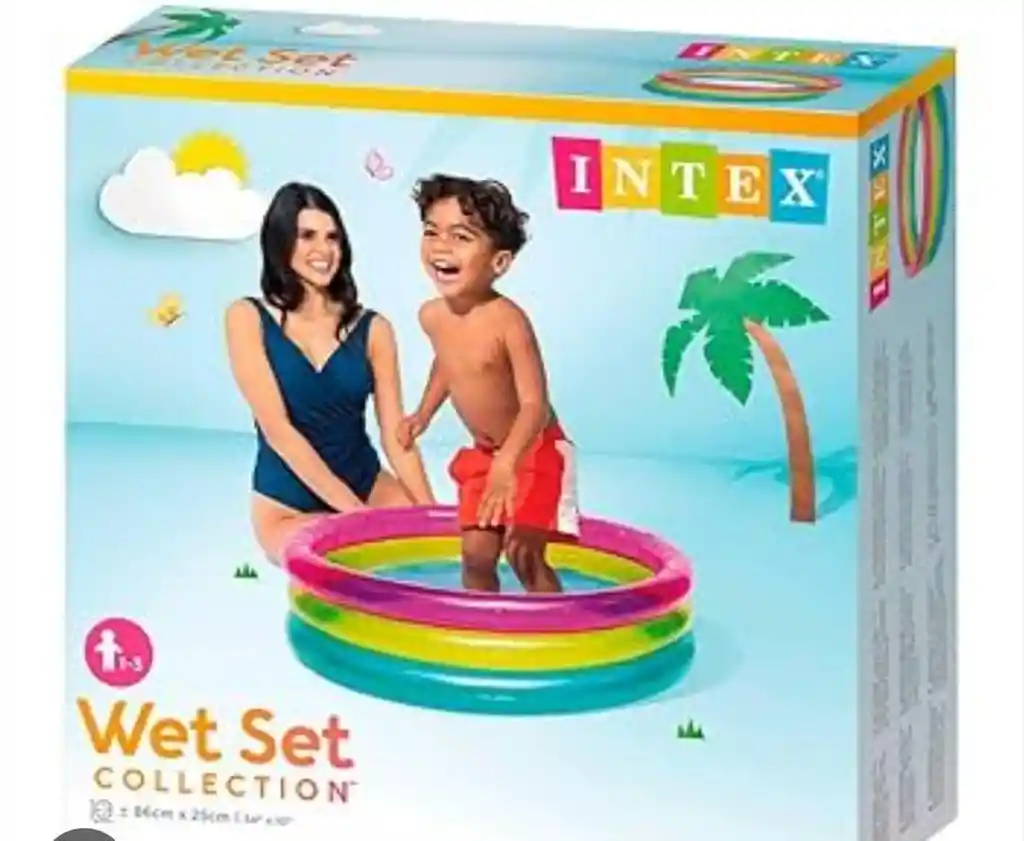 Piscina hinchable Intex infantil, con forma redonda, la piscina mide: 86x25 cm La piscina tiene una capacidad para 63 litros/agua Fabricada de vinilo resistente, tiene 3 aros transparentes y de diferente color: rosa, amarillo y azul Uso recomendado de 1 a 3 años