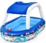 Especificaciones Principales Dimensiones: 213 cm de largo x 155 cm de ancho x 132 cm de alto. Capacidad: Puede albergar hasta 282 litros (74 galones) de agua. Edad Recomendada: Apta para niños a partir de los 2 o 3 años (siempre bajo supervisión de un adulto). Material: Fabricada en PVC (vinilo) resistente y duradero. Características Destacadas Protección Solar: Incluye un toldo desmontable con tecnología UV Careful para proporcionar sombra y proteger a los niños de los rayos solares mientras juegan. Juego Interactivo: Cuenta con un volante incorporado con bocina para que los pequeños imaginen que son los capitanes de su propio navío. Diseño Temático: Decorada con gráficos coloridos de vida marina, como delfines, peces y anclas. Fácil Mantenimiento: Posee una válvula de desagüe para un vaciado rápido y sencillo al finalizar el uso.