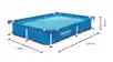 Dimensiones: 3,00 m de largo x 2,01 m de ancho y una altura de 66 cm. Capacidad: Aproximadamente 3.300 litros de agua cuando se llena al 90% de su capacidad total. Construcción: Cuenta con una estructura de acero resistente a la corrosión y paredes fabricadas con material DuraPlus™ de tres capas (una malla de poliéster entre dos capas de PVC) para mayor durabilidad y resistencia a los pinchazos. Características Adicionales: Incluye una válvula de drenaje con control de flujo integrada para facilitar el vaciado conectándola a una manguera de jardín. Dependiendo del paquete, puede incluir una bomba de filtrado de 1.249 l/h.