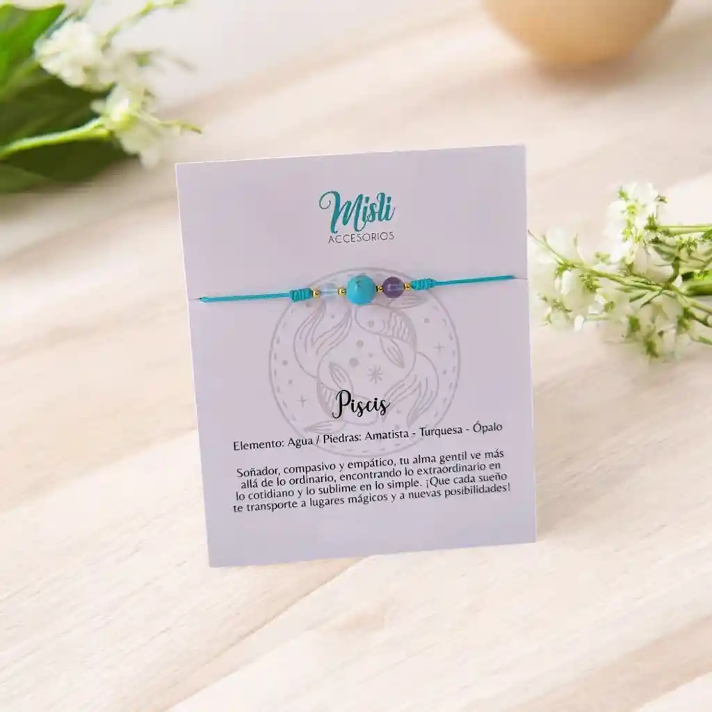 Conéctate con la energía de tu signo zodiacal Lleva contigo la fuerza de los astros con nuestra pulsera zodiacal con piedras naturales. Cada una está cuidadosamente diseñada con piedras auténticas que potencian las cualidades de tu signo, brindándote protección, equilibrio y armonía. Características: - Hecha con piedras naturales seleccionadas según tu signo: PISCIS: Turquesa - Ópalo - Amatista. - Energía alineada con tu elemento zodiacal (agua, fuego, tierra o aire) - Diseño exclusivo y ajustable para mayor comodidad Ya sea que busques fortaleza, serenidad o una conexión más profunda con el universo, este accesorio será tu amuleto ideal. Elige la tuya hoy y deja que el poder de los astros ilumine tu camino. Si deseas un color de hilo diferente al de la publicación, indícanos por mensaje una vez realices tu compra. Estamos atentos a responder cualquier duda o información adicional que necesites, con gusto te atenderemos!!