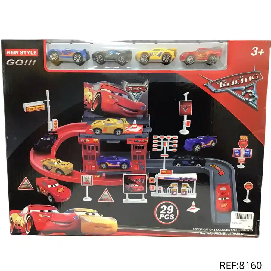 Set de pista Cars con 29 piezas y autos incluidos. Ideal para fans de Rayo McQueen. ¡Diversión garantizada!