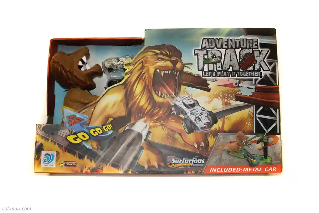 Espectacular pista de carros surfurious, utiliza tu carro para destruir el león o gorila. Este producto incluye una pista, el león o gorila, un carro metálico y accesorios. Tienen sonido de tu animal preferido, la cabeza del animal se mueve para impedir el paso del auto.