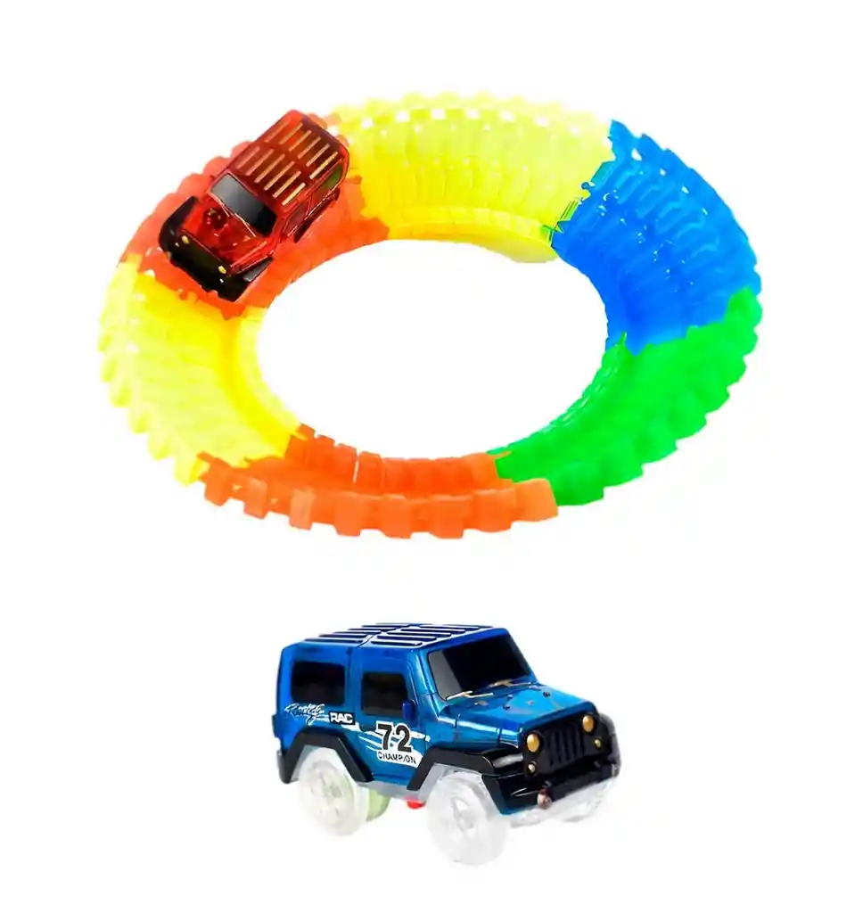 ¡Prepárate para una carrera llena de luz y velocidad con esta increíble pista mágica! Construye el circuito de tus sueños uniendo las piezas flexibles y de colores neón que brillan en la oscuridad, permitiéndote crear infinitas combinaciones de curvas y formas alucinantes. Una vez que tu pista esté lista, enciende el auto de carreras motorizado, que cuenta con potentes luces LED, y míralo correr a toda velocidad por tu creación, iluminando todo a su paso. Este set es perfecto para desatar la imaginación y la creatividad, transformando cualquier espacio en un espectacular show de luces y adrenalina que garantiza horas de diversión sin fin. /// El juguete incluye baterías /// Ficha Técnica: Material: Plástico ABS Dimensiones Del Vehículo : 7 cm x 5 cm x 4 cm Cantidad de Piezas : 56 PCS Apto para: + 3 Años Referencia: 909-261 Certificado de conformidad: CS-LCO-13233-2021S2/432 ** _Para defectos de fábrica o retractos: \_Por favor revise el producto apenas lo reciba y antes de usarlo. No aplican ley de retracto o defectos de fábrica luego de usar el producto. Se manejan máximo 5 días para reportar defectos de fábrica (por ejemplo, producto funciona mal, piezas faltantes, rotas, etc). Para hacer efectiva la devolución el producto debe devolverse con el empaque original, el cual debe estar en buen estado, incluir todos los documentos y las partes completas y sin daños.