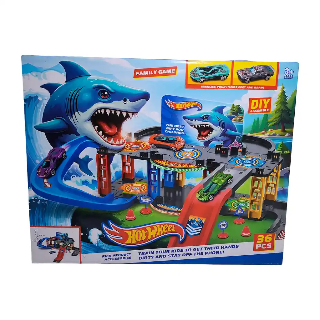¡Prepárate para una aventura de alta velocidad y adrenalina donde solo los más rápidos sobreviven al ataque del tiburón! Con esta increíble Pista de Garaje para armar, la diversión comienza desde el primer momento, ensamblando una estación de varios niveles con emocionantes rampas y un espectacular looping desafiado por las fauces de un feroz tiburón. Lanza los carros incluidos por las rampas, mira cómo toman la curva a toda velocidad y atrévete a pasar por el aro sin ser atrapado. Este completo set de 36 piezas, que incluye accesorios y dos vehículos, es el regalo perfecto para fomentar la creatividad, las habilidades motoras y horas de juego imaginativo lejos de las pantallas. ¡Construye, compite y escapa para convertirte en el rey de la pista! Ficha Técnica: Material : ABS Edad Apta + 3 años Dimensiones del empaque : 41 cm x 33 cm x 5 cm Referencia: 876-11 Certificado de conformidad: E5-0359-2021 ** _Para defectos de fábrica o retractos: \_Por favor revise el producto apenas lo reciba y antes de usarlo. No aplican ley de retracto o defectos de fábrica luego de usar el producto. Se manejan máximo 5 días para reportar defectos de fábrica (por ejemplo, producto funciona mal, piezas faltantes, rotas, etc). Para hacer efectiva la devolución el producto debe devolverse con el empaque original, el cual debe estar en buen estado, incluir todos los documentos y las partes completas y sin daños.
