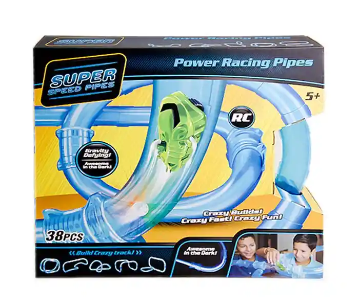 "¡CONSTRUCCIONES LOCAS!; las tuberías se pueden configurar y reconfigurar con uno o más bucles o se pueden construir para subir por las paredes. DESAFÍA LA GRAVEDAD CON LA VELOCIDAD; los vehículos son tan rápidos que pueden trepar por las tuberías El vehículo ILUMINADO Y DE CONTROL REMOTO agrega emoción, creando un espectáculo de luces impresionante cuando la habitación está oscura. También incluye una bola estroboscópica cósmica. Zipes Speed Pipes es el primer juguete en el que los vehículos pasan por tuberías transparentes en lugar de por encima de las vías. PRIMER juguete donde los vehículos aceleran dentro de las tuberías en lugar de en las vías. Pilas: Pilas AA de 2 '' (incluidas) 38 piezas. Contenido: 1 RC pipe racer 1 control remoto 1 bola estroboscópica 16 tubos curvados 3 tubos rectos 12 conectores 1 instrucciones Edad: 5+ "