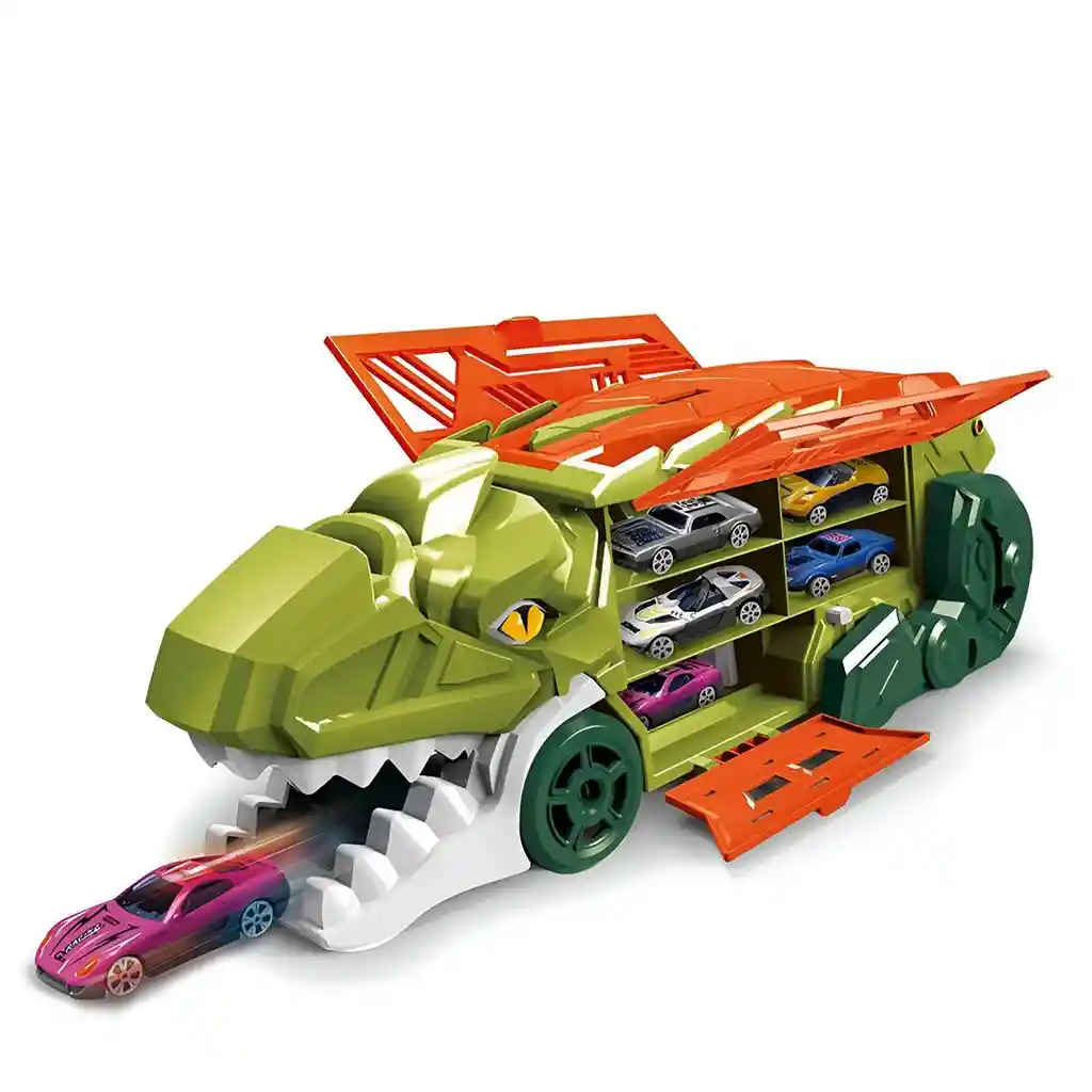 Este increíble camión lanzador de dinosaurio es un set lleno de acción y diversión que combina el mundo jurásico con la velocidad de los autos deportivos, ya que tiene forma de dinosaurio y cuenta con compartimentos para guardar múltiples carros que pueden salir disparados desde su boca con solo presionar un botón deslizante. Su diseño resistente y colorido lo convierte en un juguete llamativo, mientras que su función de lanzamiento agrega emoción a cada juego, permitiendo a las niñas y niños a partir de 3 años recrear carreras espectaculares y aventuras llenas de imaginación. /// Contenido de la caja: Garage y 6 carros /// Ficha Técnica: Material : Plástico ABS Edad Recomendada : +3 Años Dimensiones de la pista Pista: 48 cm x 12.5 cm x 11.5 cm Material del vehículo: Plástico ABS no toxico. Certificado de conformidad: E5-0359-2021 Referencia: 660-S121 Términos de garantía: Para defectos de fábrica o retractos: Por favor revise el producto apenas lo reciba y antes de usarlo. No aplican ley de retracto o defectos de fábrica luego de usar el producto. Se manejan máximo 5 días para reportar defectos de fábrica (por ejemplo, producto funciona mal, piezas faltantes, rotas, etc). Para hacer efectiva la devolución el producto debe devolverse con el empaque original, el cual debe estar en buen estado, incluir todos los documentos y las partes completas y sin daños.