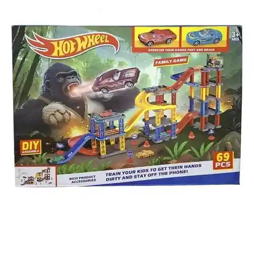 l artículo es un set de juego de Hot Wheels para armar, con la temática de un gorila atacando. El set incluye 69 piezas para armar. Está diseñado como un "juego familiar" para niños mayores de 3 años. El set viene con un vehículo Hot Wheels. El texto en la caja sugiere que el juego fomenta la construcción manual y reduce el tiempo de pantalla.