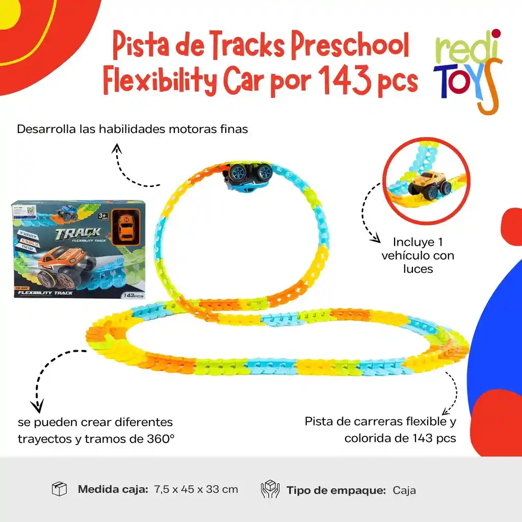 Pista de carreras flexible y colorida de 143 pcs, contiene un vehículo con luces, que se emsambla a la pista, inclyue 1 carroceria adicional. Se puede doblar, flexionar y curvar rápida y facilmente en 360° de diferentes formas, Ayuda a desarrollar la motricidad, la imaginación creativa, el pensamiento lógico y la orientación espacial.