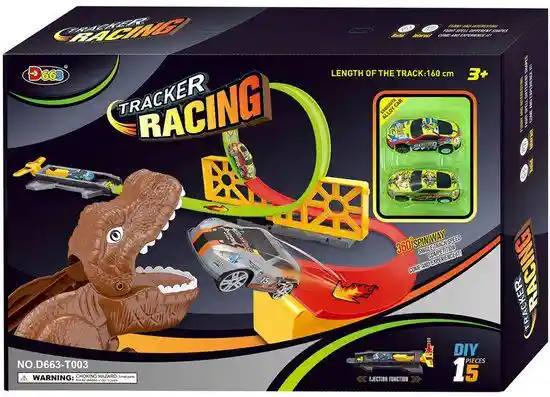Este juguete es un set de iniciación de carreras de coches con temática de dinosaurios. Es un juguete de piezas armables (DIY). Incluye un circuito con una rampa y un bucle de 360 grados. La longitud de la pista es de 160 cm. Diseñado para niños mayores de 3 años.
