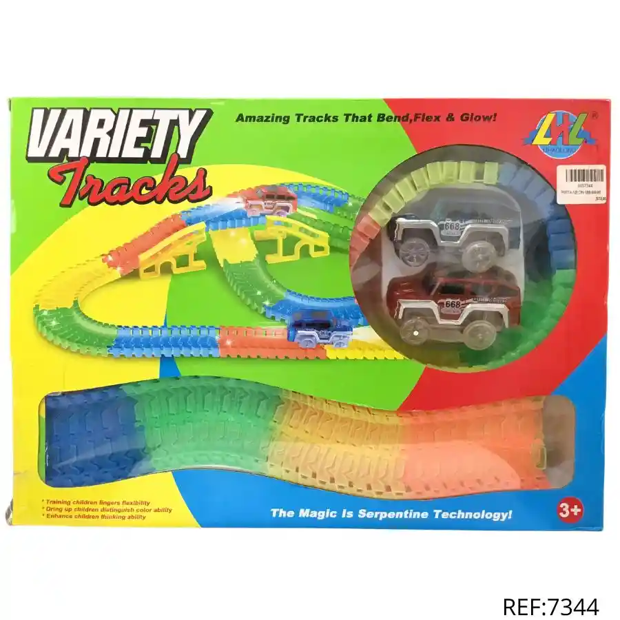 Pista flexible y luminosa con autos incluidos. Ideal para niños desde 3 años. ¡Diversión que se adapta y brilla!
