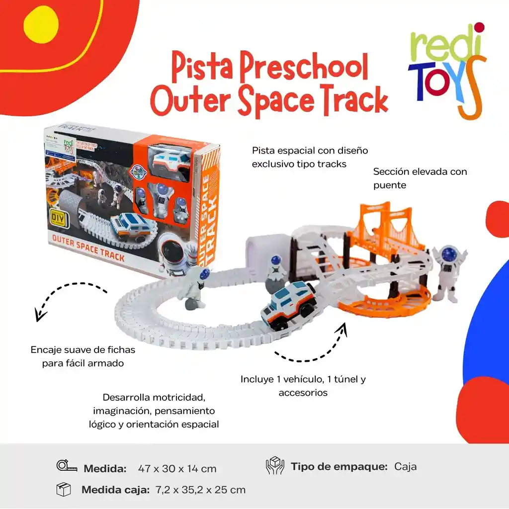 Pista con diseño exclusivo espacial, tipo tracks que permite encajar suavemente las fichas. Contiene 1 vehículo, 1 tunel y varios accesorios. Permite armar una sección de la pista elevada en la cual lleva 1 puente. Ayuda a desarrollar la motricidad, la imaginación creativa, el pensamiento lógico y la orientación espacial.