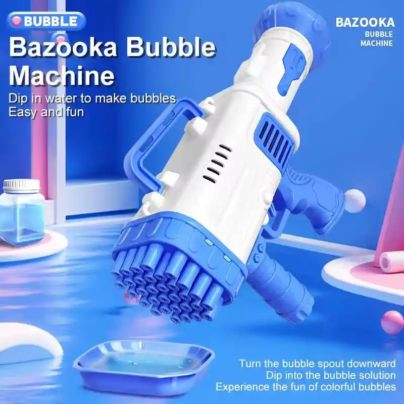 ¡Llena el aire de magia y diversión! Esta Bazooka de Burbujas es el juguete definitivo para exteriores. Gracias a su cabezal con múltiples orificios, es capaz de lanzar cientos de burbujas por minuto con solo apretar el gatillo. Fácil de usar: Simplemente vierte el líquido en la bandeja, sumerge la punta de la pistola y ¡dispara! Diversión garantizada: Ideal para fiestas infantiles, bodas, días de campo o tardes en el jardín. Diseño ergonómico: Ligera y con un agarre cómodo para las manos de los niños. El paquete incluye: Pistola de burbujas, bandeja para inmersión y solución jabonosa.