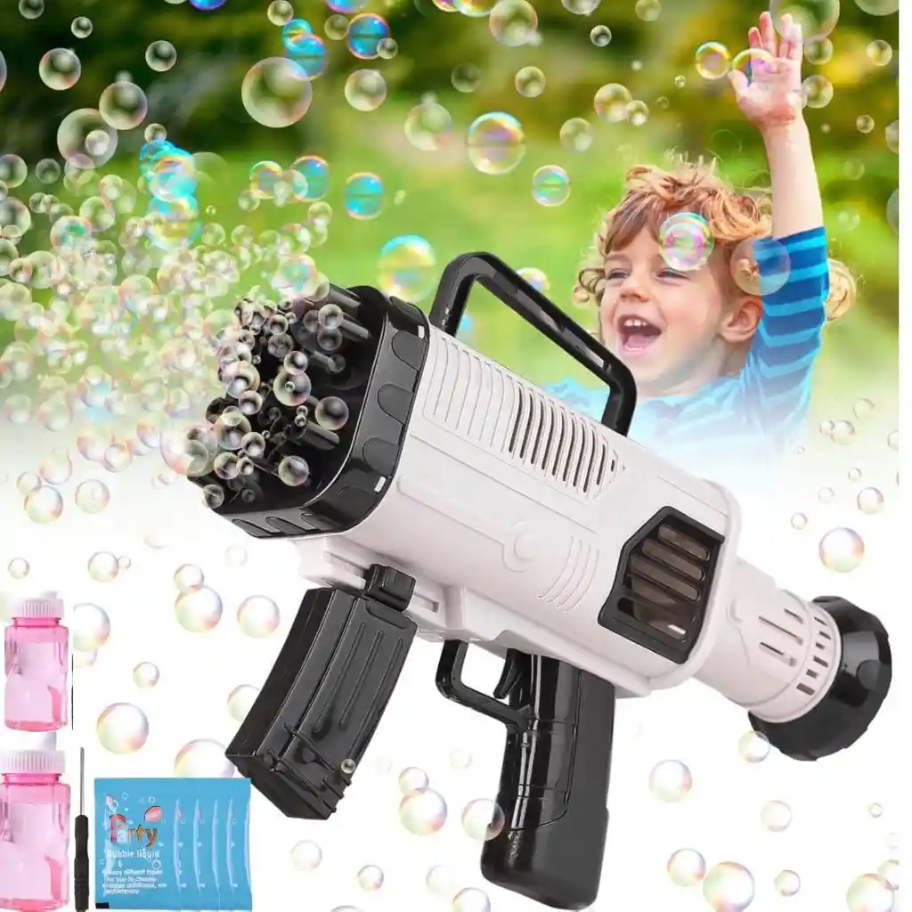 ¡Llena el aire de magia y diversión! Esta Bazooka de Burbujas es el juguete definitivo para exteriores. Gracias a su cabezal con múltiples orificios, es capaz de lanzar cientos de burbujas por minuto con solo apretar el gatillo. Fácil de usar: Simplemente vierte el líquido en la bandeja, sumerge la punta de la pistola y ¡dispara! Diversión garantizada: Ideal para fiestas infantiles, bodas, días de campo o tardes en el jardín. Diseño ergonómico: Ligera y con un agarre cómodo para las manos de los niños. El paquete incluye: Pistola de burbujas, bandeja para inmersión y solución jabonosa.