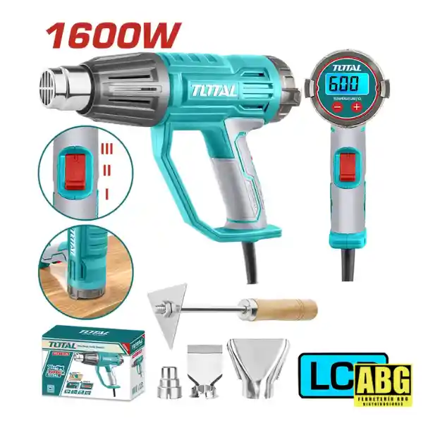 🔥 Pistola de Calor TOTAL 1600W con Pantalla LCD Digital La pistola de calor TOTAL de 1600W es una herramienta potente, precisa y versátil, ideal tanto para uso profesional como doméstico. Diseñada para ofrecer un control exacto de la temperatura, cuenta con pantalla LCD digital, permitiendo ajustar el calor según cada trabajo específico. ⚙️ Características principales: Potencia: 1600W Pantalla LCD con indicador de temperatura en tiempo real Control de temperatura ajustable, ideal para trabajos delicados y exigentes Interruptor de 3 niveles para un manejo eficiente del flujo de aire Diseño ergonómico con empuñadura antideslizante para mayor comodidad Base estable para uso en posición vertical 🧰 Incluye accesorios: Boquillas intercambiables para diferentes aplicaciones Espátula / raspador con mango de madera Boquilla concentradora y boquilla plana