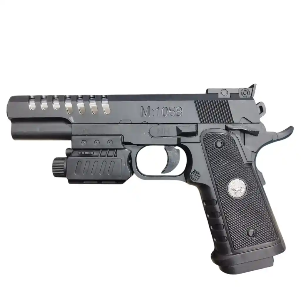 Pistola de Balines M1058 con Láser – Réplica Deportiva de Precisión con Mira Integrada Lleva tu experiencia de tiro recreativo al siguiente nivel con la Pistola de Balines M1058 con láser integrado, una réplica táctica de alto realismo, diseñada para quienes buscan precisión, estilo y seguridad en cada disparo. Ideal para aficionados al airsoft, coleccionistas y entrenamientos recreativos. ✅ Características destacadas: Mira láser incorporada: Mejora la puntería y la experiencia de uso, especialmente en interiores o condiciones de baja luz. Diseño realista y ergonómico: Réplica inspirada en armas tácticas, con acabados detallados y un agarre cómodo para mayor control. Construcción resistente: Fabricada en polímero ABS de alta calidad, ligera pero sólida para un uso prolongado. Disparo por resorte (spring): Sistema manual fácil de usar, ideal para principiantes o práctica recreativa. Municiones estándar: Utiliza balines plásticos de 6mm (BBs), seguros para prácticas en entornos controlados. 📦 Incluye: Pistola M1058 Mira láser integrada (puede incluir baterías o requerir instalación) Set inicial de balines (opcional, depende del empaque) 🔧 Especificaciones técnicas: Modelo: M1058 con láser Tipo: Pistola airsoft (resorte / spring) Calibre: 6mm BB (balines plásticos) Material: Polímero ABS Longitud: Aproximadamente 20–25 cm Alcance efectivo: 10–15 metros Función láser: Activación mediante botón lateral 🎯 Uso recomendado: Prácticas de tiro recreativo Simulaciones tipo airsoft Juegos en espacios privados Entrenamiento básico de puntería Exhibición o colección