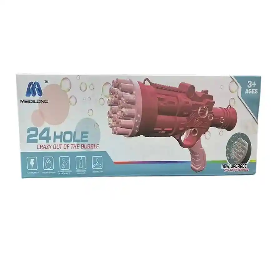 PISTOLA DE BURBUJAS, Es un juguete diseñado para crear burbujas de forma automática. Cuenta con 24 orificios para producir una gran cantidad de burbujas simultáneamente.