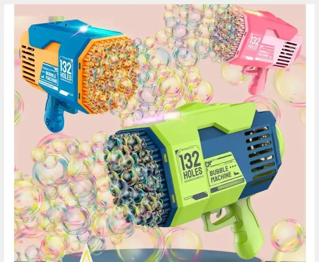 ¡Perfecto para fiestas! Con esta pistola de burbujas podrás sorprender a tus hijos en sus fiestas. También se puede usar para crear un lindo ambiente en una sesión fotográfica. NOTA: NO tiene tanque de liquido, se usa de forma tradicional mojando los agujeros. CARACTERÍSTICAS: - Plástico resistente - Con 132 agujeros - Batería extraíble recargable TE ENTREGAMOS: 1-Pistola de burbujas de 132 agujeros 2-Liquidos de burbujas 1-Batería recargable 1-Cable USB NOTA: NO incluye cargador, solo el cable USB. Puedes usar un cargador de celular de máximo 5V 1A o un puerto USB de computador.