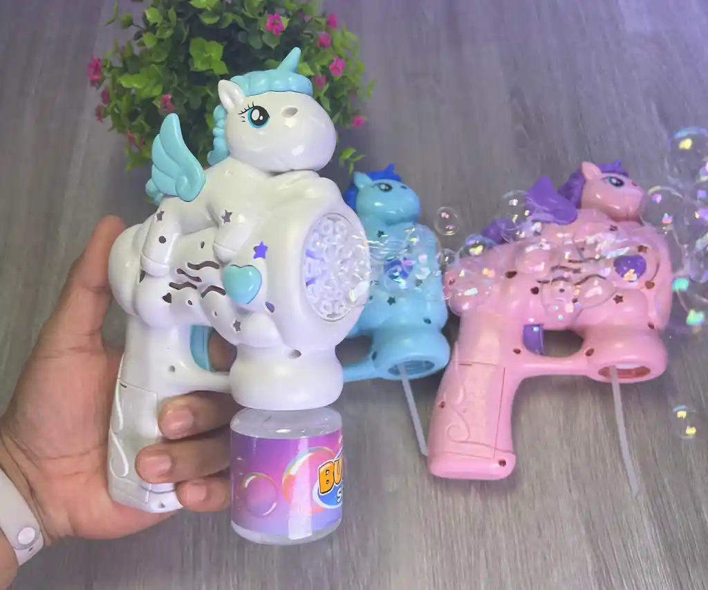 🦄Adorable diseño de Unicornio 🌈Colores: Rosado | Azul turquesa | Blanco 🫧 Incluye un bote de líquido 🔋Funciona Con 4 Baterías +AA (NO las incluye)