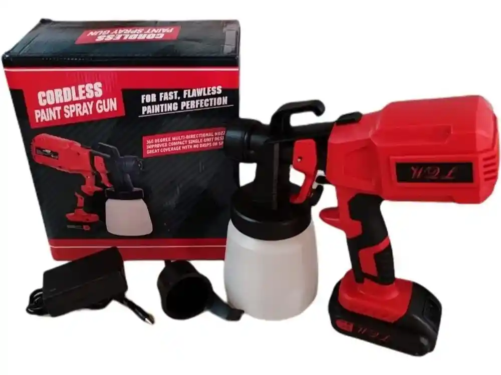 Diseño inalámbrico, una solución perfecta para el problema de que la línea de alimentación no es lo suficientemente larga Pistola Pulverizadora de Pintar 21V De 800ML 32000 RPM 650ML / min Envase de pintura (800ML) Boquilla: (1.8 / 2.5 MM) Tapa de la boquilla de ajuste del patron de pulverizacion - Libre de regular la salida de pintura ajustando la perilla de control de flujo del pulverizador - Tres patrones de pulverización: patrón redondo, patrón vertical y patrón horizontal. Puedes elegir un patrón para dispersar la pintura de la manera deseada. - Amplia aplicación, adecuado para revestir puertas, ventanas, paredes, vallas, terrazas, techos, suelos, armarios, muebles para el hogar y otros objetos. - La copa de viscosidad ayuda a identificar si el material de pintura es lo suficientemente delgado. CONTENIDO DE LA CAJA; 1 PISTOLA PARA PINTAR 1 BATERIA LI-ION DE 68V 1 CARGADOR 1 HERRAMIENTA PARA LIMPIAR LA BOQUILLA 1 COPA DE PLASTICO PARA LA VISCOSIDAD 1 MANUAL DE INSTRUCCIONES ( EN INGLES)