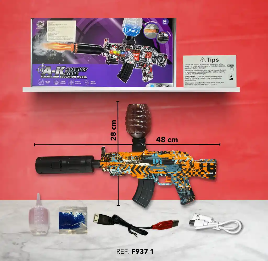 PISTOLA DE HIDROGEL AK F937 1 ¡Precisión y diversión! Ideal para juegos al aire libre, actividades con amigos o competencias de puntería. * Disparo automático con balines de gel, siente la emoción de una batalla real con ráfagas continuas. * Tanque recargable superior para gran capacidad de munición y disparos más duraderos. * Motor de alta velocidad que garantiza un excelente rendimiento y alcance. * Batería recargable por USB, juega sin preocuparte por las pilas. * Incluye botella recargable, munición de gel, cargador USB y accesorios completos. * Colores grafiti disponibles: Naranja | Azul | Rojo.