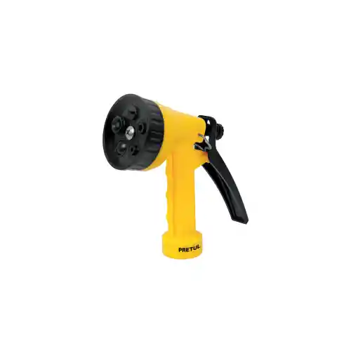 Pistola plástica para riego de 5", 5 funciones, PRETUL Cuerpo fabricado en polipropileno • Clip para flujo continuo, permite que el agua fluya sin apretar constantemente Color Amarilla Conexión 3/4 - 11.5 NH Peso 58 g Empaque individual Tarjeta
