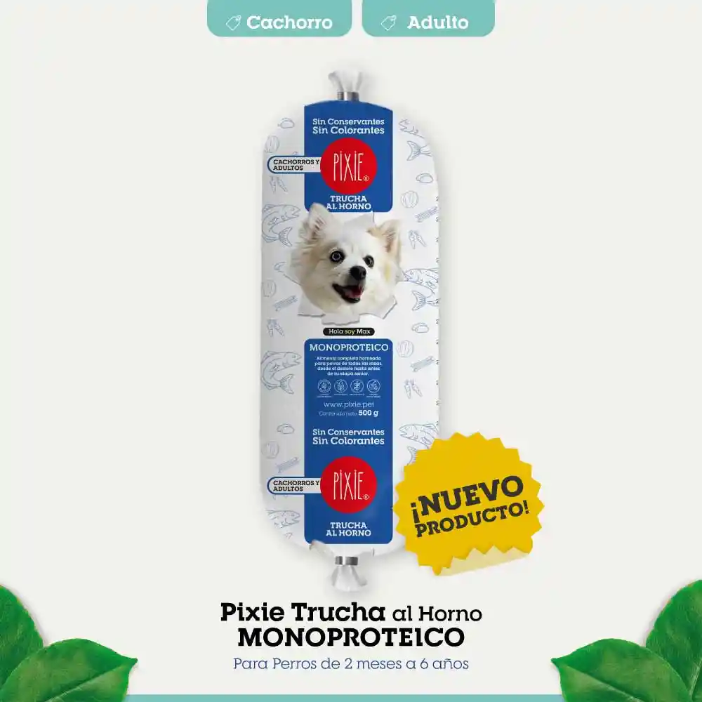 PIXIE MONOPROTEICO TRUCHA AL HORNO PARA CACHORROS Y ADULTOS Alimento Monoproteico de Trucha Horneado, Completo y Natural para perros de todas las razas, desde el destete hasta antes de su etapa Senior. Dirigido a pacientes con reacciones adversas a los alimentos de tipo inmunitario.
