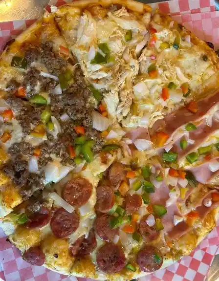 Queso mozzarella, salsa napolitana, carne molida, pollo, chorizo, pimentón y cebolla