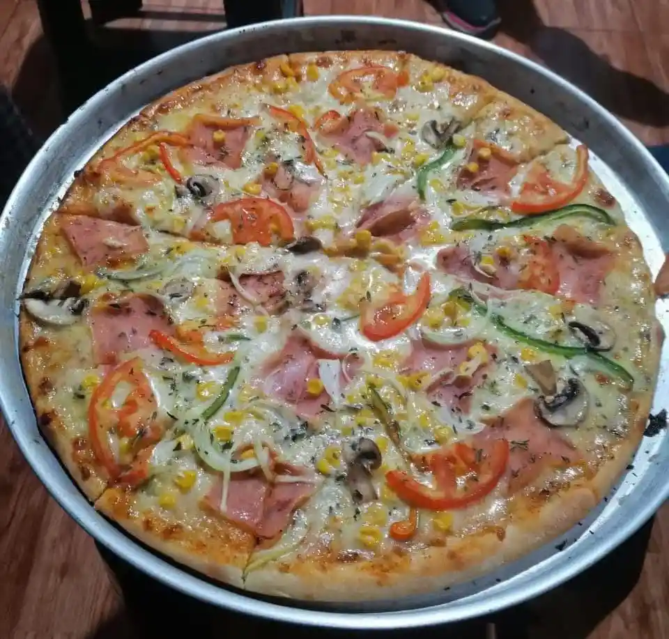 Pizza Kúrkuma de 35 cm salsa de casa, queso Mozzarella, tomate, pimentón, cebolla cruda, maíz, aceitunas, tocineta, jamón, cebolla caramelizada, champiñones y orégano